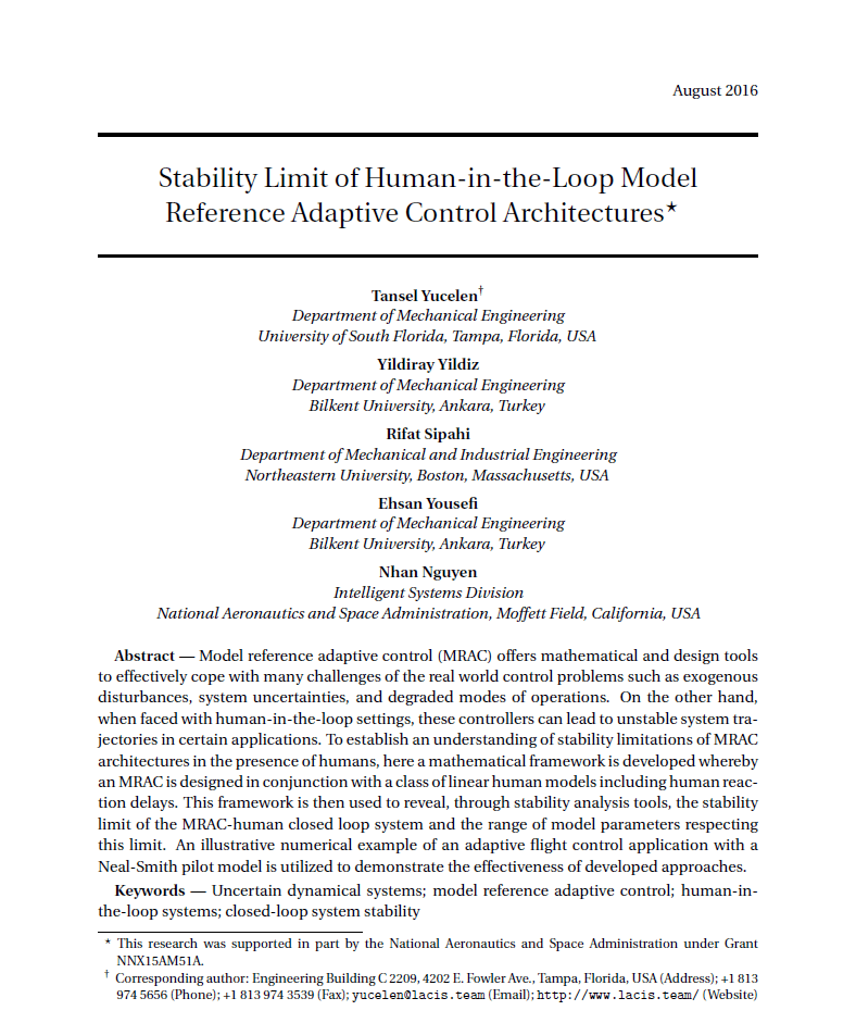 1) Habboush, A., Yildiz, Y., “An Adaptive Pilot Model with Explicit Reaction Time-Delay for Adaptively Controlled Systems,” IEEE Conference on Decision and Control, 2022.