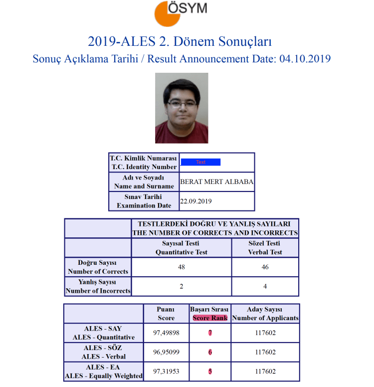Our lab member Mert Albaba is ranked 5th (fifth) among 117,000 participants in national Academic Personnel and Graduate Education Entrance Exam. Congratulations Mert!